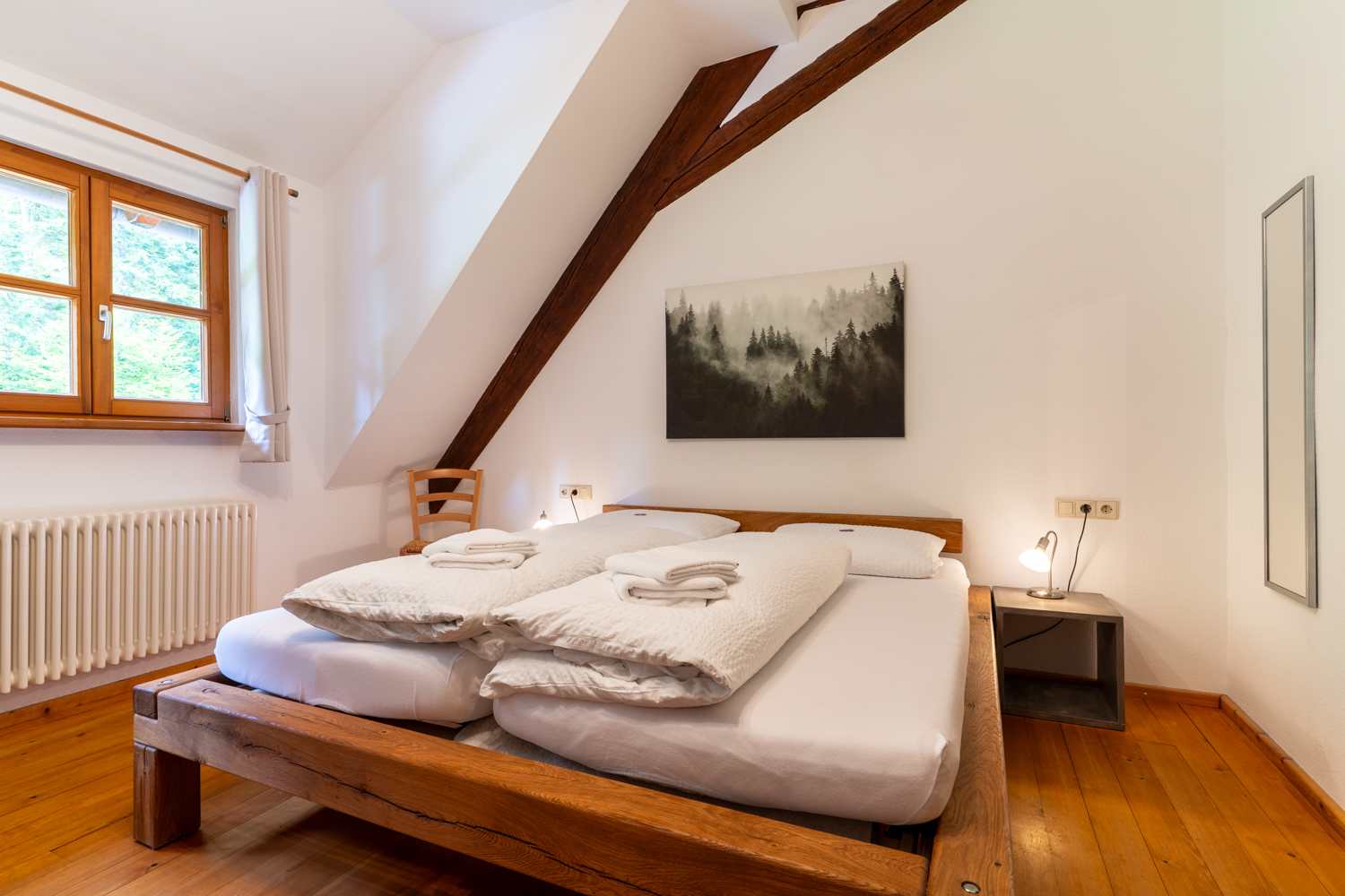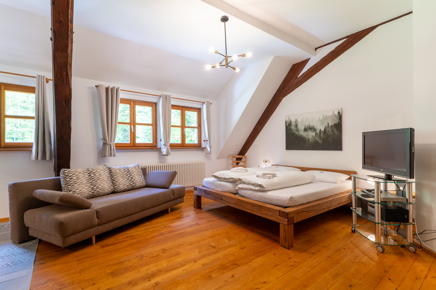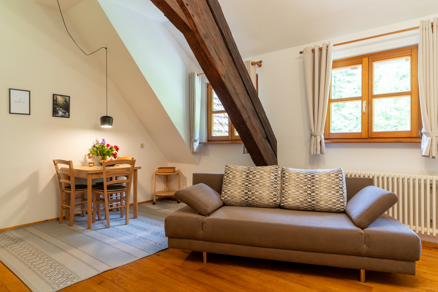 Hier wohnen Sie im gemütlichen Ambiente der ehemaligen Heubühne unseres historischen Hofgebäudes. Sehr ruhig gelegen (Westseite mit Blick zum Fluss Kleine Kinzig) finden Sie hier alles was Sie zum Wohlfühlen brauchen. Übrigens: Diese Wohnung liegt Tür an Tür zur Ferienwohnung Hof und eignet sich durch ihre Lage direkt gegenüber perfekt zum Dazubuchen für Oma, Opa, Freunde…