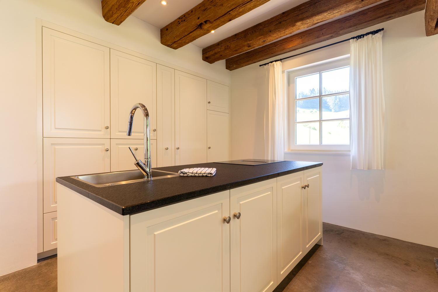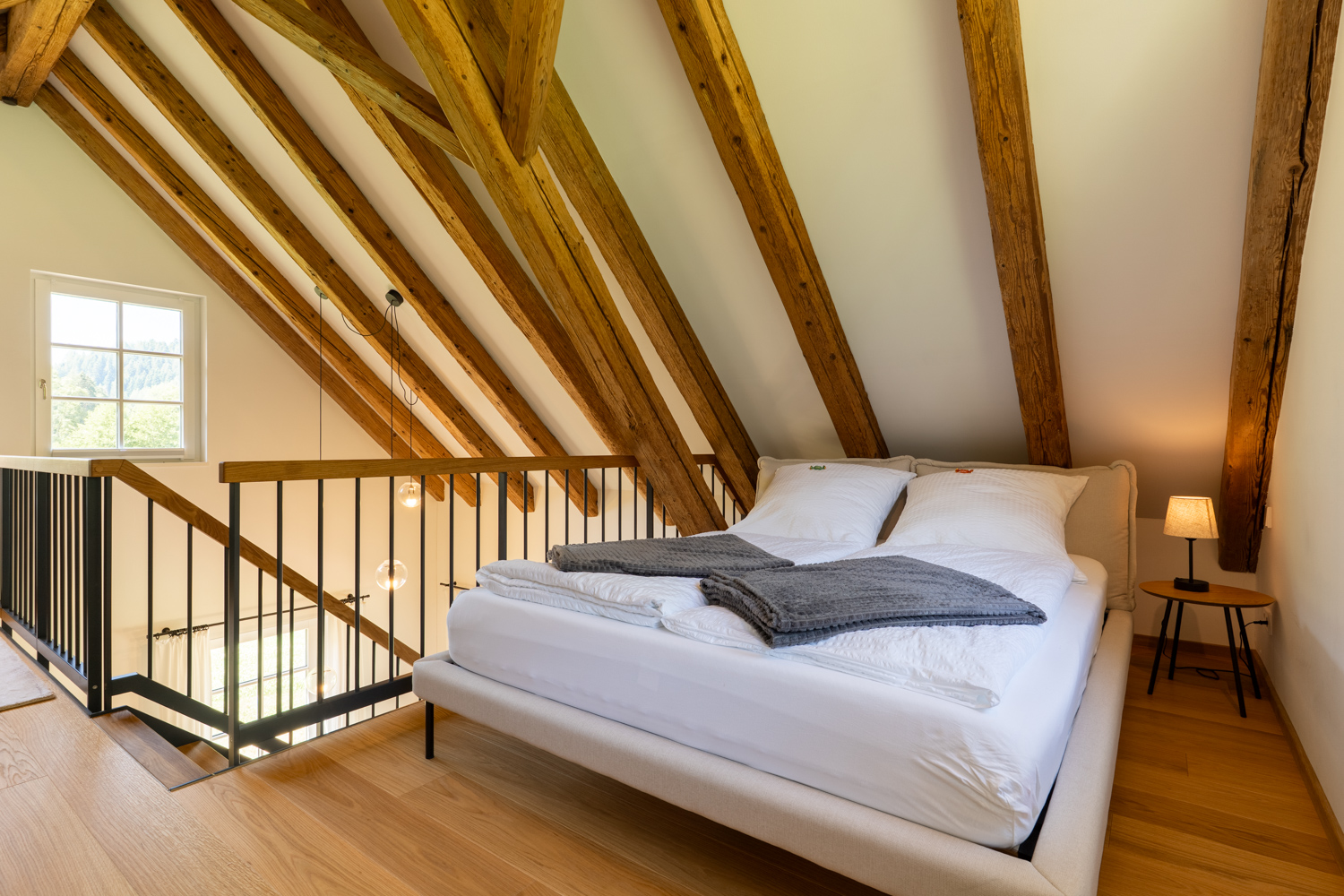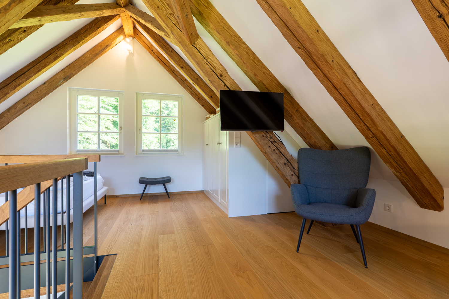 Die „Alte Mühle“ ist ein charmantes, kleines Ferienhaus, das Ruhe und hochwertigen Komfort inmitten der Natur bietet. Das Maisonette-Häuschen kombiniert rustikale Architektur mit modernen Akzenten und ist geprägt von offenem Gebälk, das dem Raum eine großzügige, luftige Atmosphäre verleiht. Der Wohnbereich im Erdgeschoss verbindet sich fließend mit der modernen Küche. Eine freistehende Treppe führt zum gemütlichen Schlafbereich im oberen Stockwerk, von wo aus man einen schönen Blick auf das Bächlein und die umliegenden Wiesen genießt. Ein besonderes Highlight ist die großzügige Terrasse. Hier kann man bei einem Kaffee das sanfte Rauschen des Wassers genießen oder beim Lesen entspannen. Dank der hochwertigen Ausstattung ist die „Alte Mühle“ der perfekte Rückzugsort, um neue Energie zu tanken und den Alltag hinter sich zu lassen. Die Renovation der alten Mühle wurde 2024 gefördert durch LEADER Mittlerer Schwarzwald.